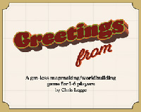 Greetings From ______ is a mapmaking/worldbuilding game for 1-6 players. Players take turns moving around the map and creating what they find there. Work together to build a unique world that can be used for other role-playing systems, creating stories, or whatever else you might want to use it for (because sometimes you just want to make a cool map).